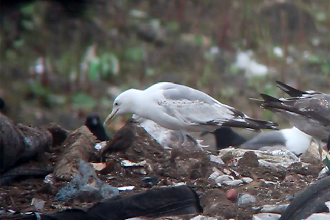 The landfill site and sand quarry at Shawell are strictly private and the gulls are not viewable from any public area. It has taken me three years to gain access and it still isn't easy to get good views. The gulls have many choices of places to go and it is not possible to chase them. I have had training from Lafarge Tarmac in order to enter the quarry, which was very kind of them. Hopefully in the future I will be given permission to get closer to the working part of the tip. The gull in the photo below first appeared when the rain had soaked my eyepiece, but I saw enough to think it might have been a Caspian. It re-appeared on the tip in slightly drier conditions and it stayed in view long enough to see that it was a Caspian Gull. Its slender proportions were obvious when compared to three bulky third year Yellow-legged Gulls that were close by. The photo was made from a video, so it has lost a bit of detail, but you can get the idea. In the photo its bill has lost the black mark near the tip and its shape is not quite right to how it looked in the field. You can see that it is long and slender though.